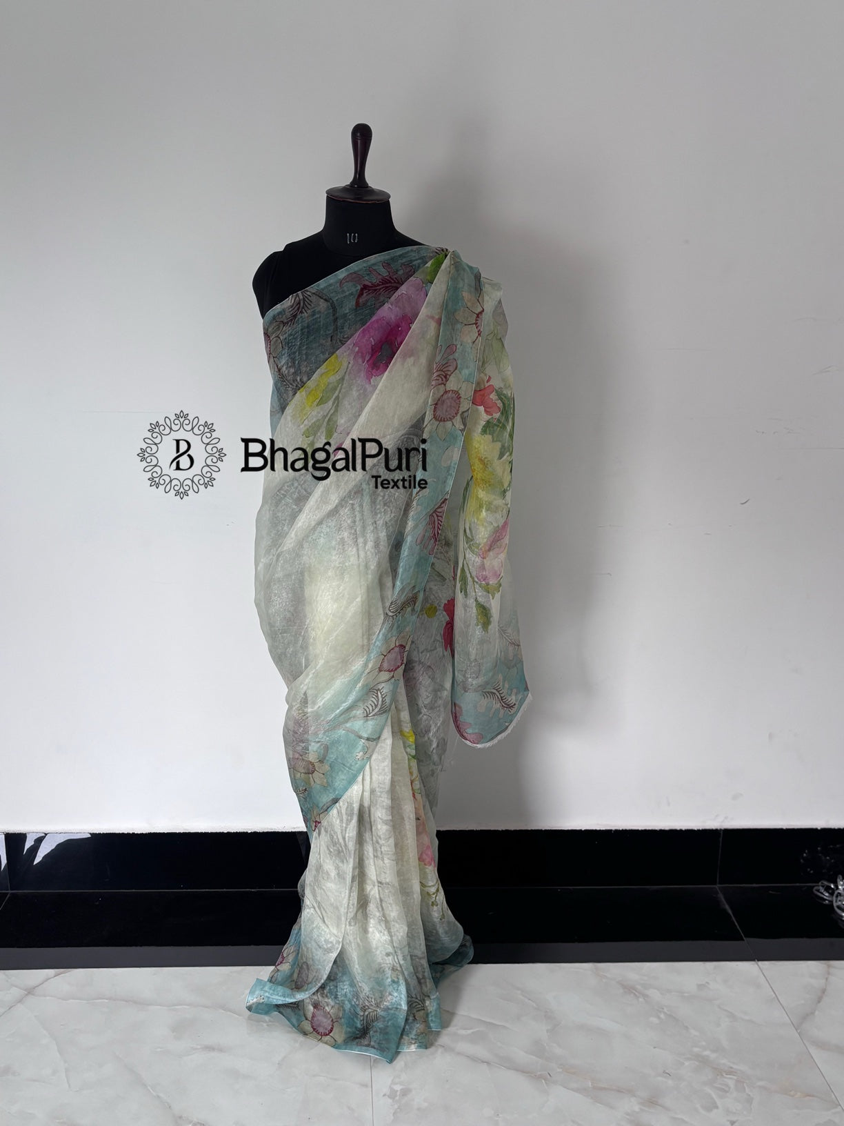 • Organza Digital Print Saree: Experience the beauty of vibrant digital prints on luxurious organza fabric.